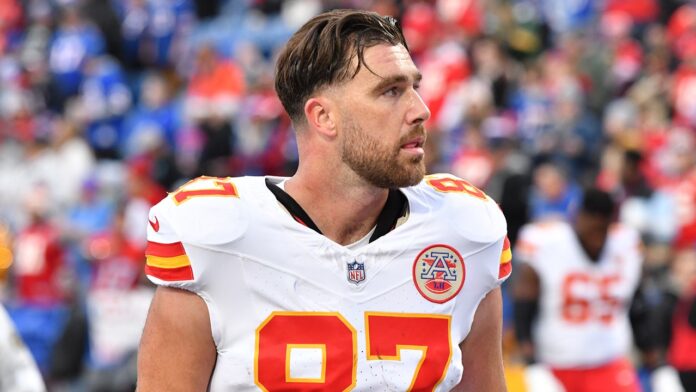 Kansas City Chiefs tight end Travis Kelce, #87, leaves the field after warmups before a game against the Buffalo Bills at Highmark Stadium in Orchard Park, New York, on Nov. 17, 2024. (Mark Konezny-Imagn Images)