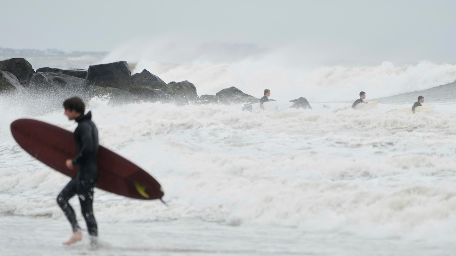 Beaches were closed to swimming Thursday in New York City, but more than a dozen surfers still rode waves at Rockaway Beach in Queens. Scott Klossner, who lives nearby, said conditions were great for experienced surfers.