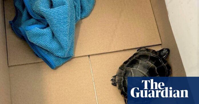 When questioned further, the man reached into his pants and pulled out the turtle, which was about 5in (12cm) long and wrapped in a small blue towel. He said it was a red-ear slider turtle, a species that is popular as a pet.